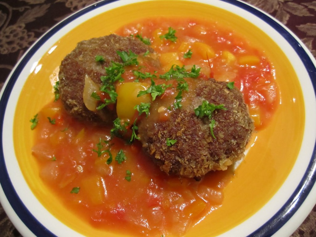 Cotletas go well with different sauces. This time I made my favorite tomato sauce, with addition of some sweet peppers. In a small sauce pan saute 1 diced onion, add 1 big diced tomato, 1 tsp sugar, salt, pepperoncini, and simmer for 10 minutes, then add yellow, red or green peppers (or all of them), diced or cut in small pieces, add about 1/2 to 1 cup water and simmer about 5 minutes. At the end thicken with flour to desired thickness (1-2 tsp flour mixed well with 1/2 cup water – no lumps), and add more salt if necessary. Voila!