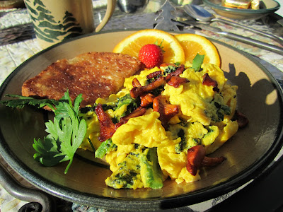 Free range eggs and chantrelles each have their own distinctive flavor, but together they make an unbelievable duet. M-m-m-m-m-m-m!