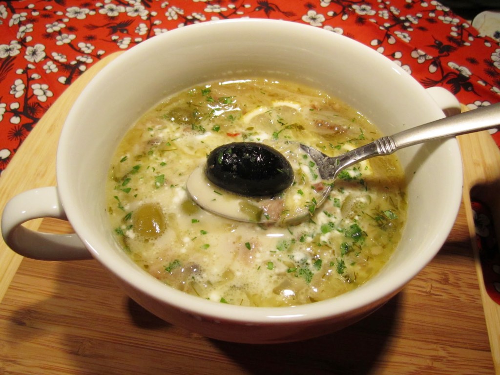 Browsing through famous Cookbook by Elena Molokhovets, I suddenly remembered this soup: loaded with different meats, cucumbers, olives, cabbage, and mushrooms. Sounds good, doesn’t it? So I thought, and made it for the first time in my life. It was just what we needed at this time of winter stress…